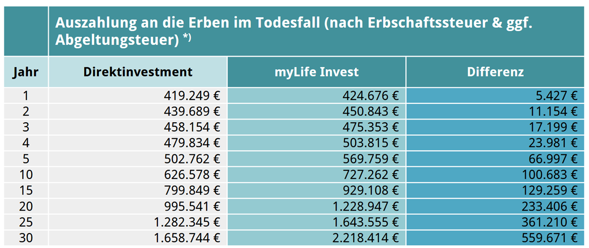 Sie investieren alle zehn Jahre bis zu 800.000 Euro (pro Kind, bei gemeinsamer Schenkung beider Elternteile). Ihre Kinder werden zu 99 % Vertragspartner, während Sie und Ihr Ehepartner 1 % behalten – und damit die volle Kontrolle. Das Kapital wird so strukturiert, dass es den Kindern beispielsweise erst zum 60. Geburtstag zur Verfügung steht – als Baustein ihrer Altersvorsorge. Mit Ihrer Zustimmung können während Ihrer Lebenszeit jederzeit Änderungen oder Auszahlungen erfolgen. Im Todesfall erfolgt die Auszahlung vollständig steuerfrei – ohne Erbschafts-, Einkommen- oder Abgeltungssteuer.