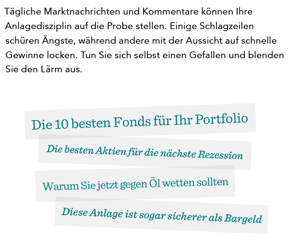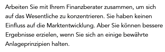 Die größte Gefahr für den langfristigen Anlageerfolg ist nicht der Markt – es ist das eigene Verhalten. Medien, Schlagzeilen und Marktprognosen erzeugen Lärm und Unsicherheit. Doch sie kennen weder Ihre Ziele noch Ihre Strategie. Wir helfen Ihnen, sich davon zu lösen. Disziplin, Klarheit und Gelassenheit sind die entscheidenden Erfolgsfaktoren für eine erfolgreiche Investmenterfahrung.