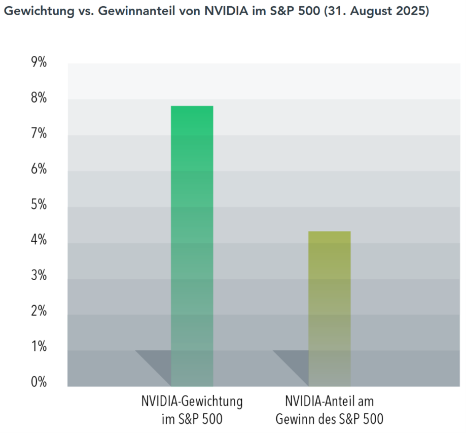 Die Gewinne von NVIDIA waren immens, das Preisschild für diese Gewinne jedoch auch. Am 31. August 2025 machte die Marktkapitalisierung von NVIDIA fast 8% des S&P 500 Index aus. In den letzten zwölf Monaten hat das Unternehmen einen Gewinn von 87 Milliarden US-Dollar erwirtschaftet, was rund 4% der Gewinne aller S&P 500-Unternehmen von rund 2 Billionen US-Dollar entspricht. Wer höhere Renditen anstrebt, sollte auf die Marktkapitalisierung und die relativ hohen Bewertungen achten. Beide deuten darauf hin, dass die Märkte weiterhin hohe zukünftige Cashflows, niedrigere erwartete Renditen oder eine Kombination aus beidem einpreisen. Aus diesem Grund kann der Kurs der NVIDIA-Aktien selbst dann fallen, wenn das Unternehmen atemberaubende Ergebnisse vorlegt.